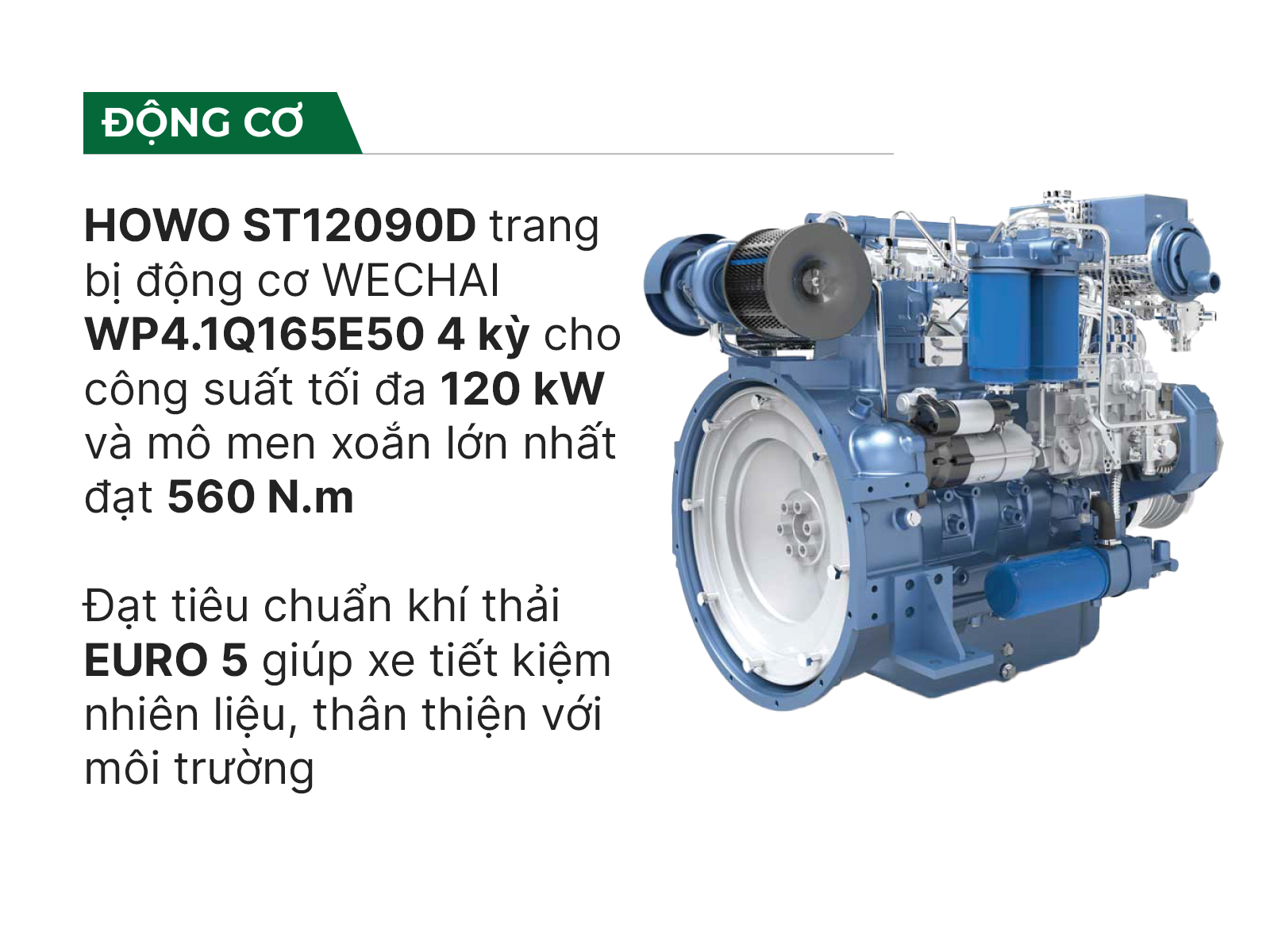 HOWO ST12090D được trang bị động cơ WECHAI WP4.4.1Q165E50 4 kỳ cho công suất tối đa 120kW cùng mô-men xoắn cực đại 560Nm. Nhờ sự cải tiến động cơ này, mẫu xe ben sở hữu sức mạnh bền bỉ và linh hoạt hơn, tối ưu hiệu quả khi vận chuyển hàng hóa đường dài. Ngoài ra, việc sử dụng động cơ mới giúp HOWO ST12090D đạt được tiêu chuẩn khí thải Euro 5, giảm thiểu ô nhiễm và tiết kiệm nhiên liệu hơn.